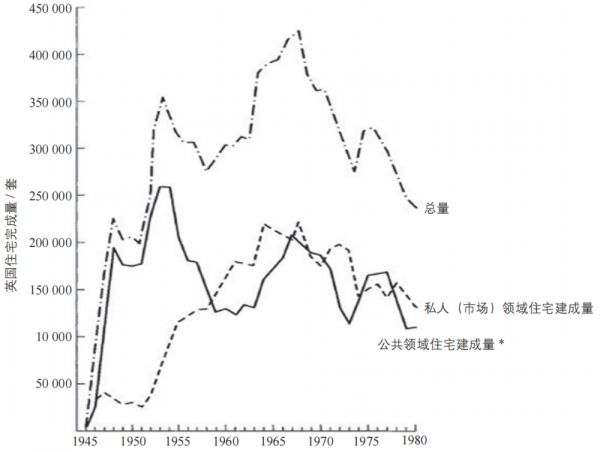 二战结束后,英国工党政府建造了超100万所房屋,其中80%是社会住房。图为1945~1980年英国全国年度住房及社会住房情况(注:*公共领域包括地方政府当局、新城开发公司和社会住房机构) (图片来源/邱君丽,刘玉亭. 英国社会住房的分配模式及其影响[J]. 国际城市规划,2021,36(4):43~52. )