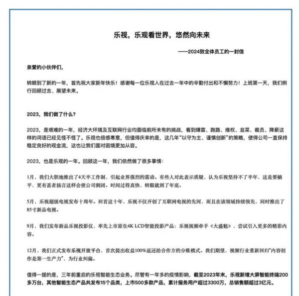 乐视于1月2日发布致全体员工的一封信,其中提到了乐视依旧对员工福利的重视,以及在持续变化的行业环境中保持稳定发展的企业策略。并且明确表示了公司2024的发展理念:不提倡互联网黑话,不扯皮不内卷,坚持内部管理数据化和依旧坚持4天半工作制度。