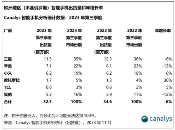 Canalys数据显示,今年第三季度,欧洲(不含俄罗斯)智能手机出货量为3200万部。相比前两名三星和苹果的出货量大跌,小米、联想和TCL等品牌的表现要更好。其中,小米出货量与去年同期持平,以19%的市场份额位居第三;联想集团旗下摩托罗拉出货量逆势增长30%,并以5%的份额跻身第四;TCL出货量同比增长5%,并以3%的份额排名第五。