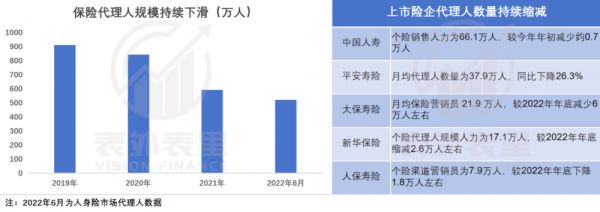 更多熬不过难关的人,则在大浪淘沙里行业里黯然退场。原银保监会显示,2019-2022年6月期间,保险代理人规模近乎腰斩,且据2023年上市险企公告数据,下滑趋势还在持续。