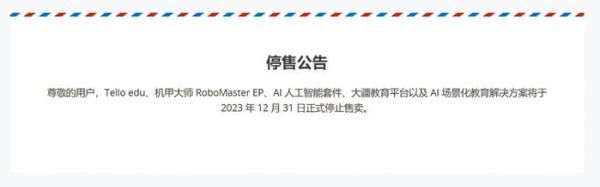 IT之家 1 月 4 日消息,大疆上个月发布公告称,其教育应用产品 Tello edu、机甲大师 RoboMaster EP、AI 人工智能套件、大疆教育平台以及 AI 场景化教育解决方案于 2023 年 12 月 31 日正式停止售卖,主要集中在青少年编程、机器人控制、人工智能学习领域,并提供赛事支持。