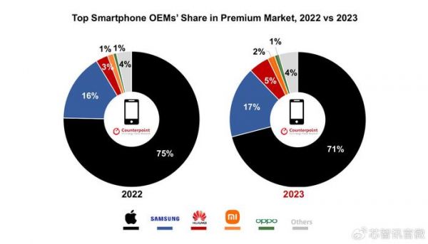 2023全球高端手机战报:苹果超七成独占鳌头、三星17%排第二、华为5%强势回归