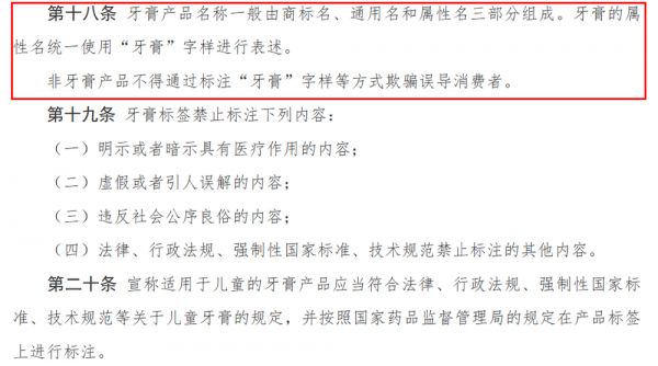 2023年12月1日起,国家市场监督管理总局发布的《牙膏监督管理办法》(以下简称新规)正式实施,可谓是给牙膏宣传念起了“紧箍咒”。新规第十八条提到,牙膏产品名称一般由商标名、通用名和属性名三部分组成,非牙膏产品不得通过标注“牙膏”字样等方式欺骗误导消费者。