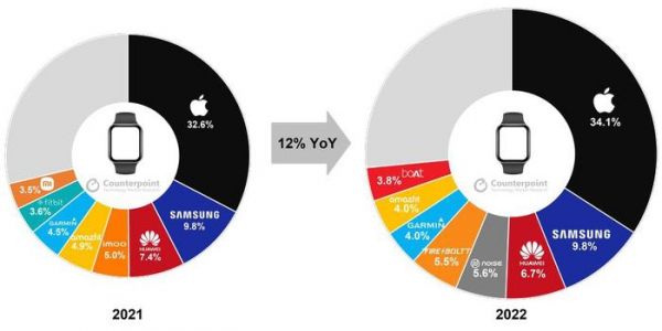 图源:Counterpoint市场调查机构Counterpoint公布的统计数据显示,苹果Apple Watch在2022年智能手表市场处于主导地位。其出货量占比为34.1%,总营收占比为60%。