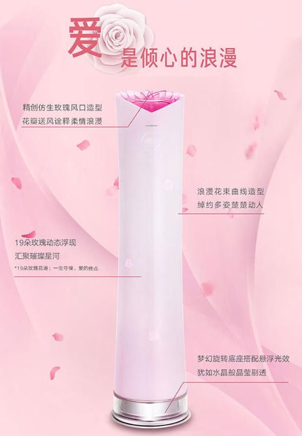 目前这款格力玫瑰空调仍然可以在线上购买,售价近3万元,造型像是一颗含苞待放的玫瑰,风口采用了仿生玫瑰的造型,空调腰身采用了类似花束的曲线设计,并且会动态浮现19夺玫瑰,而19多玫瑰花语则代表了一生守候、爱的重点。