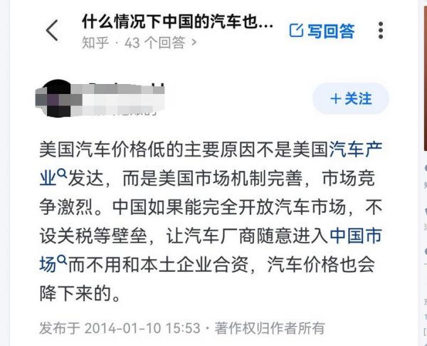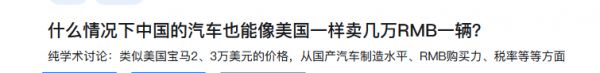 最近有个生动的回旋镖,知乎上有个2014年的老问题被翻了出来,内容是“什么情况下中国的汽车也能像美国一样卖几万RMB一辆?”,老网民应该还记得当年网上吹捧西方的一大理由就是汽车数码之类的工业产品比中国便宜,显然,这些人当年也认为便宜就是好,然而这才刚过了十年,中国已经成为世界上汽车最便宜的国家,逻辑怎么又变成了越贵越好呢?