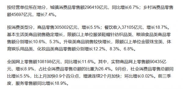 抛开产品价格,我们来看看社会消费数据有没有“降级”。旅游业前面我们已经说过,而其他消费数据与2019年相比都在增长。根据国家统计局公布的数据,前三季度社会消费品零售总额342107亿元,商品零售305002亿元,餐饮收入37105亿元,而2019年前三季度,社会消费品零售总额296674亿元,商品零售264109亿元,餐饮收入32565亿元。两者对比,社会消费品总额增长15.2%,商品零售增长15.5%,餐饮零售增长13.9%。