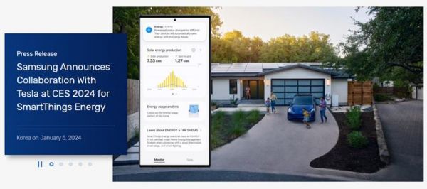 三星电子宣布,已与特斯拉建立服务集成,并将在 CES 2024 上进行展示。三星将 SmartThings Energy 连接到特斯拉产品,如 Powerwall 家用电池、太阳能逆变器、壁式连接器充电解决方案和电动汽车(EV)。