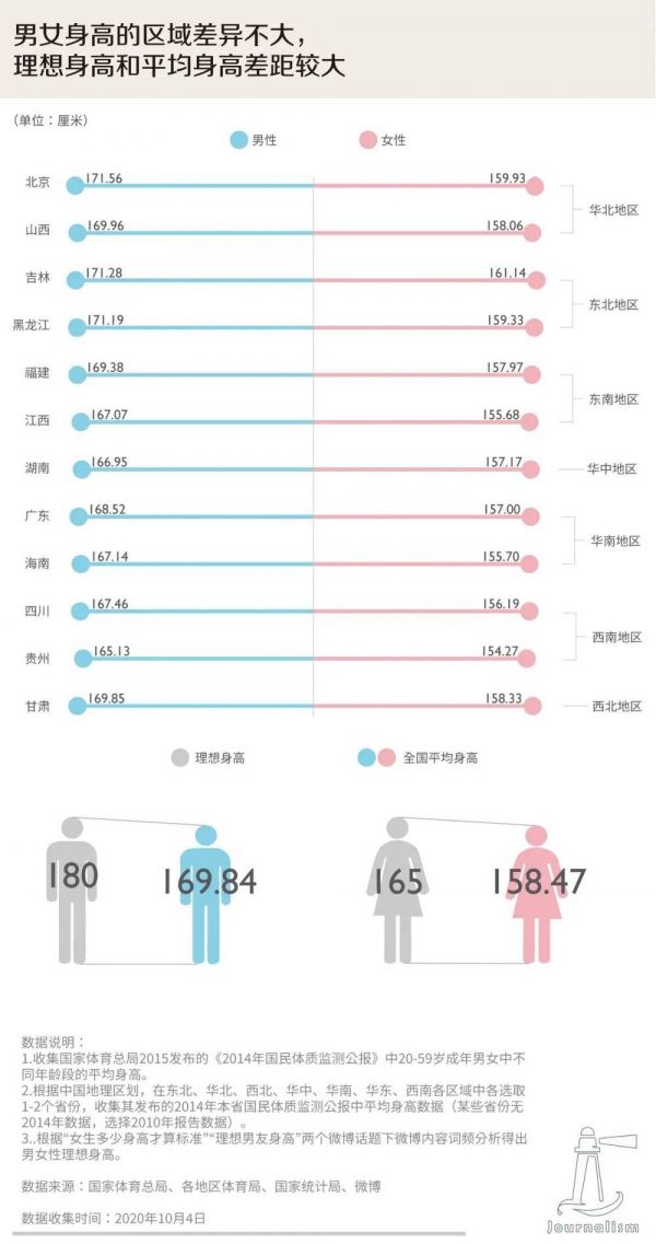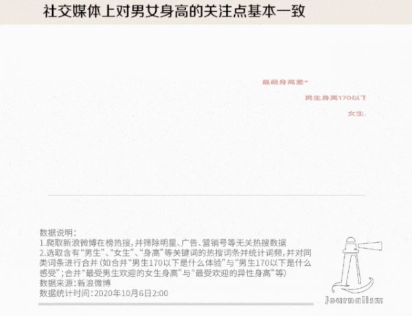 “最萌身高差”“女生有多在乎男生的身高”“女生身高155的感受”“女生身高160有多可爱”“男生身高170算矮吗”“男生身高170以下的感受”……在微博热搜上,与身高相关的话题常常榜上有名。根据相关微博话题讨论内容,社交媒体上对男女身高的关注点基本一致,所建构的理想身高分别为男性180cm,女性165cm。