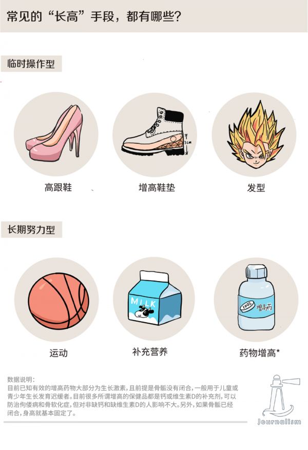为了弥合理想和现实的鸿沟,人们使出浑身解数。有的试图以生理规律为突破口,采取吃钙片、喝牛奶、锻炼拉伸等方法,希望能够抓住青春的尾巴,实现“二次发育”。有的则选择了穿增高鞋、塞鞋垫、改变发型穿搭等物理手段,希望能从视觉上改善个子不够高的形象。