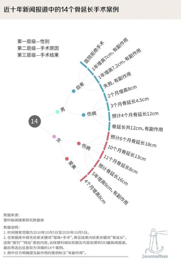 尽管国内明令禁止,但依然有健全者为了弥补身高的缺憾选择铤而走险。我们在慧科新闻搜索研究数据库中以“增高”“手术”组合关键词进行检索,经筛选后共得到583篇报道,其中不乏出于自卑心理进行手术的情况。但就结果来看,部分接受手术者尽管在某种程度上如愿以偿“长高”,但同时也面临着影响正常生活的副作用,反而得不偿失。