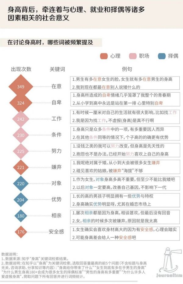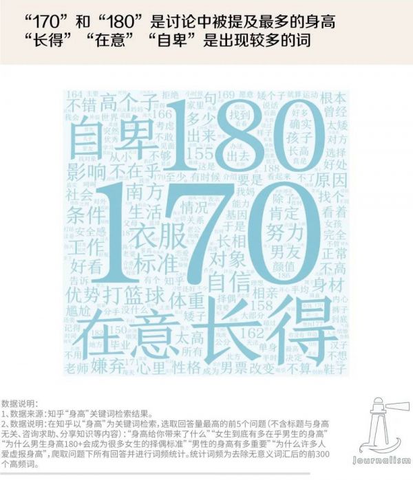 我们在知乎平台以“身高”为关键词进行检索,结果显示,讨论中提及最多的身高是“170”和“180”,提及最多的词语是“长得”“在意”与“自卑”。