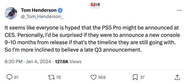 IT之家 1 月 5 日消息,外媒 insider-gaming 负责人 Tom Henderson 昨日在 X 平台发布贴文,宣称索尼将在今年第三季度公布 PS5 Pro 游戏机。