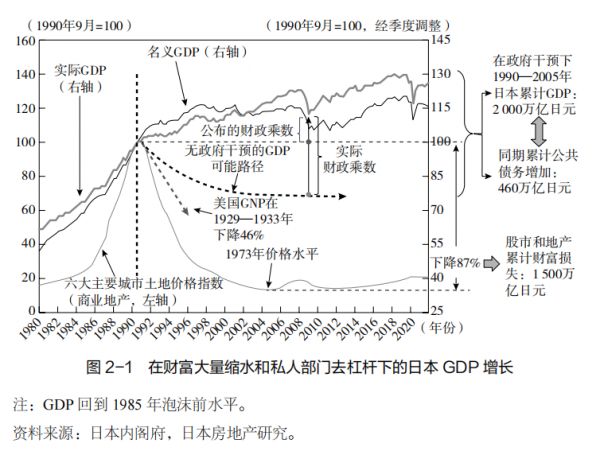辜朝明经过测算,发现1989年后的资产价格暴跌让日本损失了1500万亿日元的财富,而造成的缺口又让企业和家庭进行了至少15年的净债务偿还,这种资产负债表衰退进而消灭了相当于GDP总额20%的总需求,彻底将日本拖进了萧条的泥潭。