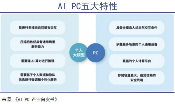 根据《AI PC 产业白皮书》,AI PC 将具备五大特性:内嵌个人大模型,拥有个性化本地知识库;拥有 CPU、GPU、NPU 本地混合 AI 算力;拥有开放的 AI 应用生态;可运用自然语言交互;拥有设备级个人数据和隐私安全保护。