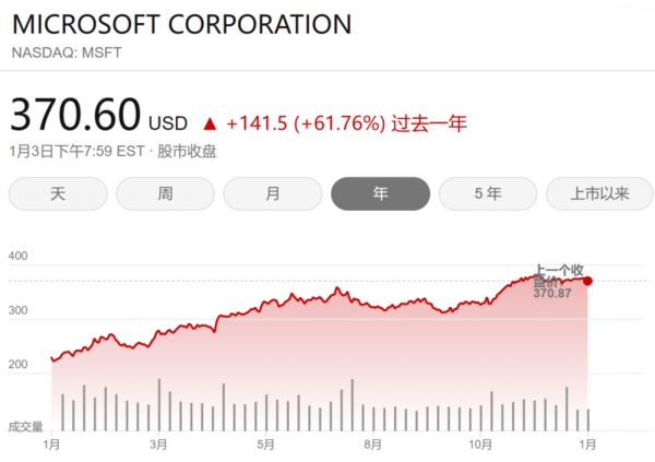 实际上微软公股价在去年已经上涨了61.76%,谷歌的股价在去年上涨了58.22%,英特尔的股价在去年上涨69.98%,AMD的股价在去年上涨109.28%,似乎美股科技公司里和人工智能相关度比较高的,股价上行趋势都非常明显。