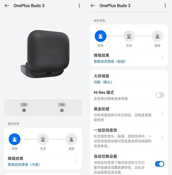 值得一提的是,一加Buds 3搭载了自研的3D环绕空间音效,深度优化了空间音频效果。并且该项功能不限设备、不限音源。在开启空间音频后,笔者能够明显感觉到声音变得更加立体了,有一种被音乐“包围”了的感觉。