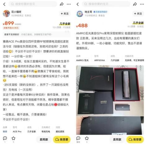 “懒逼们”不仅不愿意花时间,也不愿意耗体力。这就导致,被嫌弃的远不止大排灯,也有需要涂凝胶、调模式才能用的射频类美容仪。它们虽然出自不同的消费者之手,但会相聚在同一个二手交易平台,称得上是“同是天涯沦落仪”了。