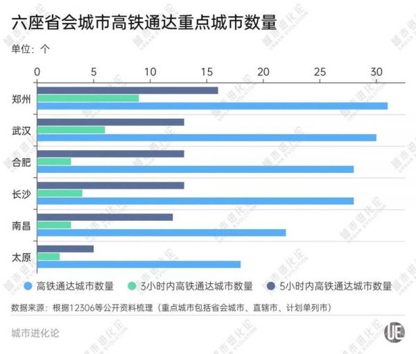 数据显示,郑州可通达重点城市数为31个,3小时、5小时内可通达的重点城市数量分别为9个、16个,各项数据均处于中部省会城市第一。武汉可通达全国30个重点城市,仅次于郑州。合肥、长沙、南昌处于第二梯队,各项数据在伯仲之间;对比其他中部省会,太原的高铁通达度则整体偏弱。
