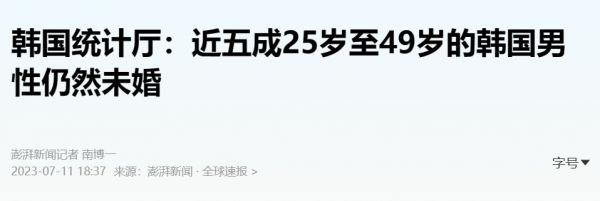 日前,韩国统计厅发布《低出生率与韩国社会的变化》显示,25~49岁的男性中近五成没有婚史,每三名女性中有一人未婚。