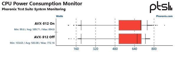 使用 AVX-512 后,双插槽至强 Platinum 8592+ 的平均功耗仅略有增加,表明英特尔明显改善了功耗效率。