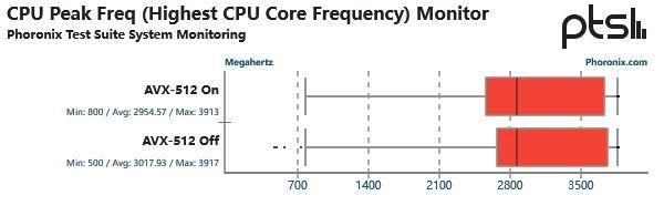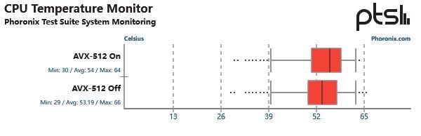 启用 / 禁用 AVX-512,CPU 核心温度的差异微乎其微,只有一度左右的差异,比前几代英特尔 AVX-512 的结果要好得多。