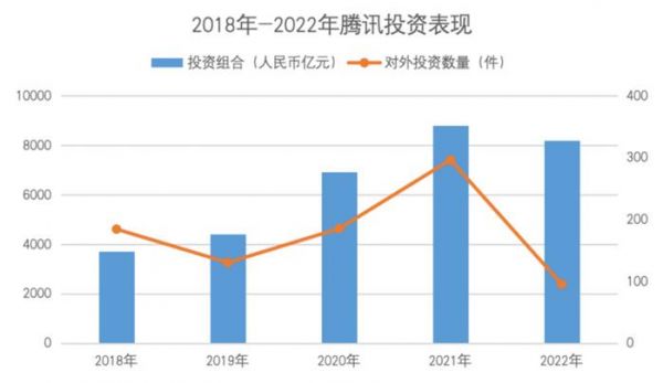 在如上所示的增速下,出于战略以及业务需要,腾讯更多地利用了此前积攒的优势资源,以投资的方式为自身“在不同行业的‘连接’策略提供补充”。其结果便是,2021年,腾讯的投资组合来到了8786.53亿元人民币的峰值;据IT桔子统计,当年腾讯对外投资的事件数量高达296件。