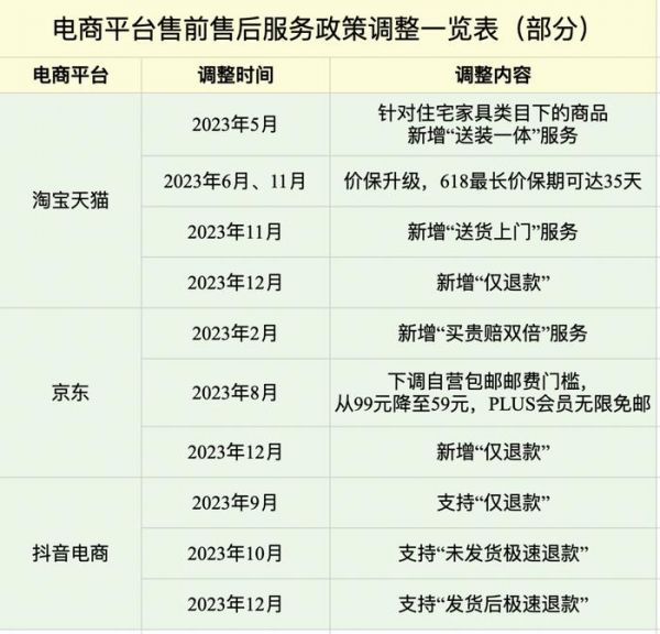 2023年以来,各大电商平台都在调整售前售后服务政策,比如京东、淘宝天猫的仅退款新政、淘宝试点送货上门、京东下调免邮费门槛,抖音电商的极速退款等等。