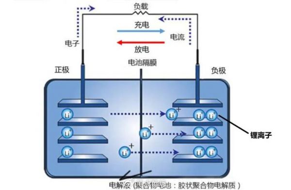 先说说锂电池的放电原理。目前主流智能手机都采用(聚合物)锂离子电池,锂电池由“正极+电池隔膜+负极”构成,放电时,负极碳层脱出锂离子,运动到正极与氧化物反应,这个过程中,电子也从负极出发,经过负载、流入正极,从而产生方向与电子运动相反的电流,给手机供电。放电过程可以参考下图(实线部分为放电过程)。