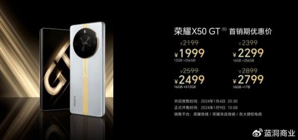 2024年1月4日,“满帧战神 强悍芯生”荣耀X50 GT新品发布会正式举行依托满帧战神引擎,荣耀X50 GT实现满帧越级、散热越级和触控越级,带给用户性能越级新体验。荣耀X50 GT首销售价1999元起,于1月4日20:30开启预售,1月9日10:08正式开售。