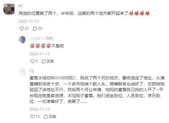 同时,也有曾经考虑过加盟蜜雪冰城的创业者表示,现在的蜜雪冰城对于没有经验的小加盟商不太友好,常常败在地址审核的终审上。还有创业者表示,“之前看过的两个选址,后来都被人开了。”