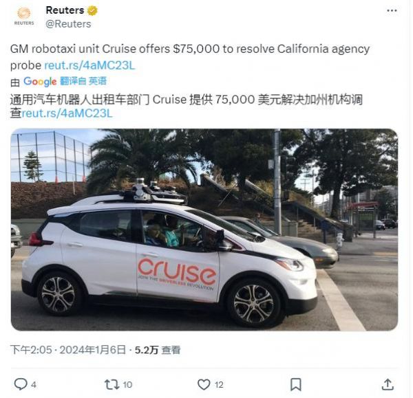 通用自动驾驶子公司 Cruise 提出以 7.5万美元了结加州车祸案调查