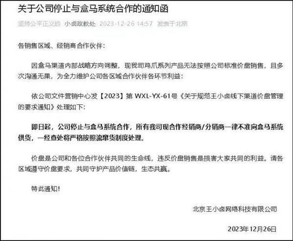 12月26日,王小卤宣布“因盒马无法按照公司标准价盘销售鸡爪系列产品,即日起,公司停止与盒马系统合作,所有我司现合作经销商/分销商一律不准向盒马系统供货,一经查处将严格按照流窜货制度处理”。