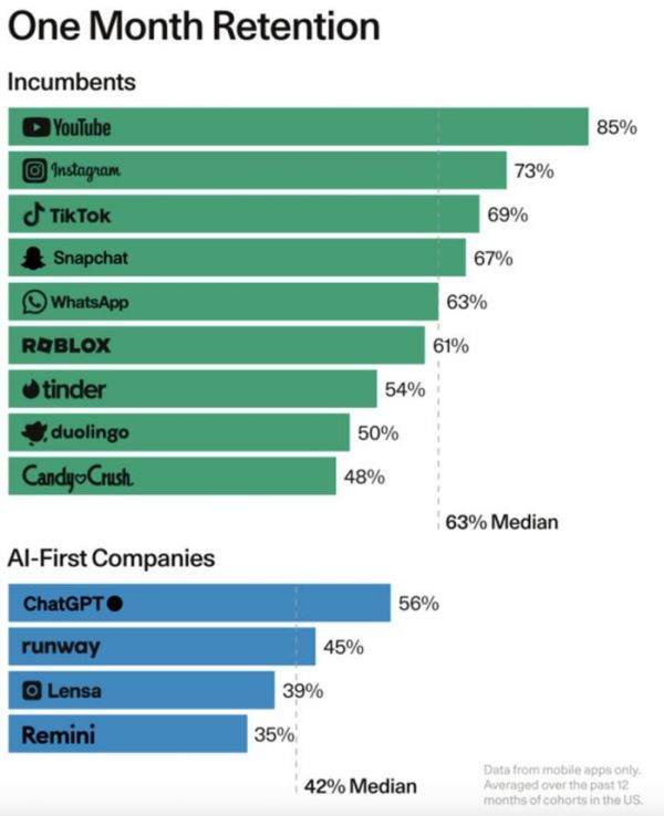 据红杉资本于《生成式AI第二幕》的数据,包括ChatGPT在内的AIGC应用,在用户的留存与活跃上可以说是完败于我们熟知的移动应用。以首月留存为例,即便是OpenAI都未能企及移动应用的中位数。