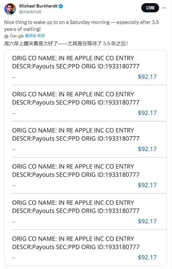 苹果已经开始向当年参与「电池门」诉讼的用户发放赔偿金,只要是参与该案并提交索赔的 iPhone 用户,都将陆续获得打款。