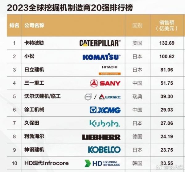 全球挖掘机新排位揭晓:徐工第6,三一第4,行业一哥年销947亿