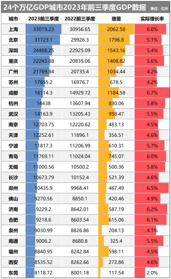 2023年前三季度,苏州GDP增速为4.2%,比全国平均增速低1个百分点。这一增速在24个万亿GDP城市中位居倒数第四,只比东莞、泉州、广州好一些。