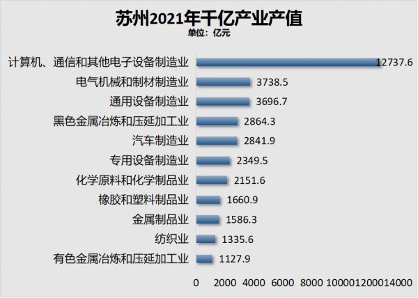 2021年末,苏州有11个千亿产业,千亿产业总值34547亿元,千亿总产值位居全国第一。上海12个,深圳6个。
