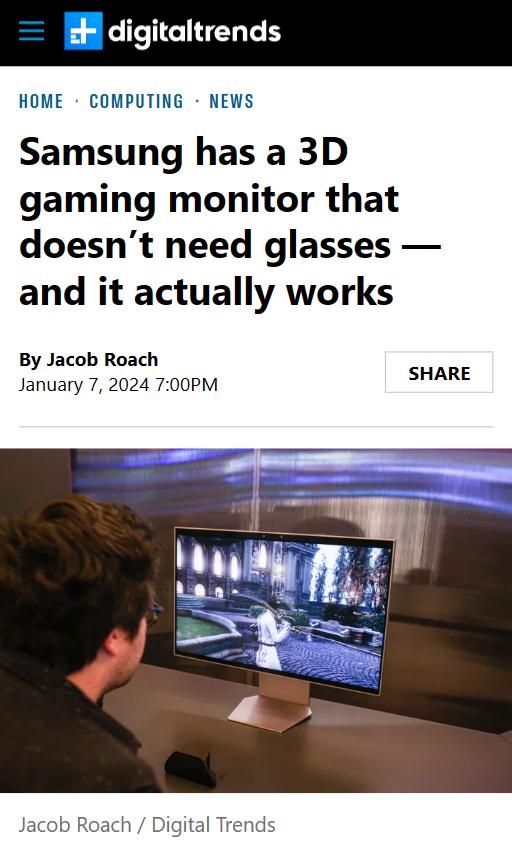 IT之家 1 月 8 日消息,三星今日在 CES 2024 上宣布正在开发一款支持裸眼 3D 的游戏显示器,外媒 Digital Trends 对概念版进行了上手体验。