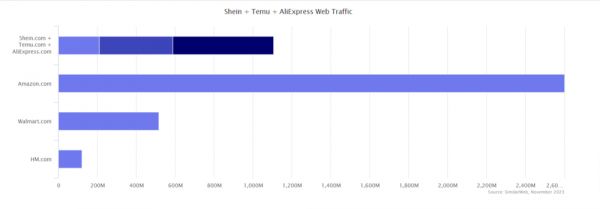 该报告还指出,SHEIN、Temu和速卖通2023年11月的网络访问量合计超过10亿次,大约是亚马逊在美国的一半,是沃尔玛的两倍。