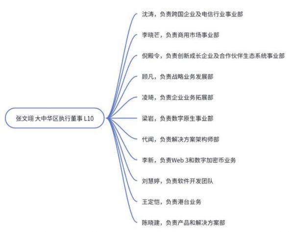 此前,这1700多人被张文翊划分为:战略业务发展部、跨国企业及电信行业事业部、创新成长企业及合作伙伴生态系统事业部、企业业务拓展部、数字原生事业部、商用市场事业部等部门,每个部门分别由一位L8高管负责,直接向张文翊汇报。