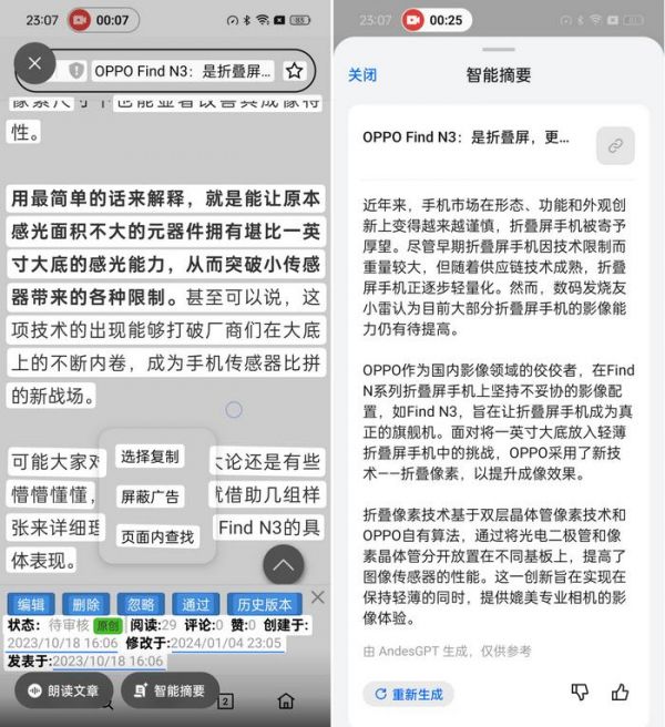 雷科技找到了一篇2000+字的长文进行测试,通过天玑9300的AI性能与OPPO自研安第斯大模型,Find X7迅速总结出了文章的重点内容,并且排版成短文展现。手持Find X7,仿佛有了一个属于自己的贴身秘书。