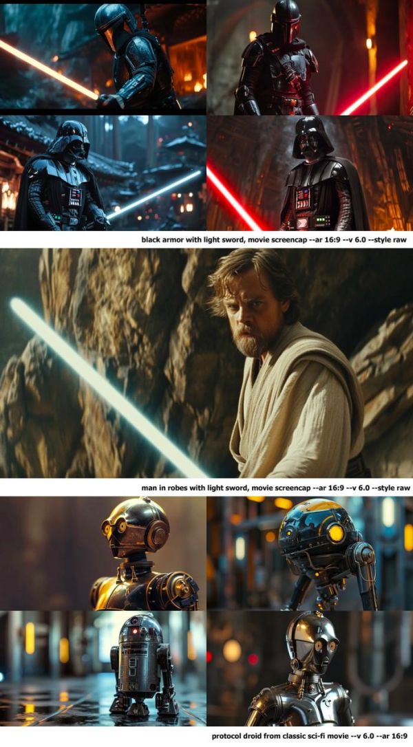 尽管提示词中并没有提及电影,但 Midjourney 还是生成了这些一眼开门的《星球大战》角色图像。而且类似的情况在电影和电子游戏领域都有体现。