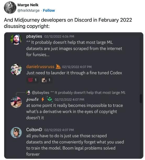 2022 年 2 月,Midjourney 开发者们在 Discord 上讨论版权问题。这类问题引发的惩罚性赔偿可能数额巨大。最近有消息人士指出,Midjourney 可能整理了一份专门用于模型训练的艺术家清单,而且似乎并没有相应的许可或补偿条款。再结合抄袭输出问题,这难免会引发一场声势浩大的集体诉讼。