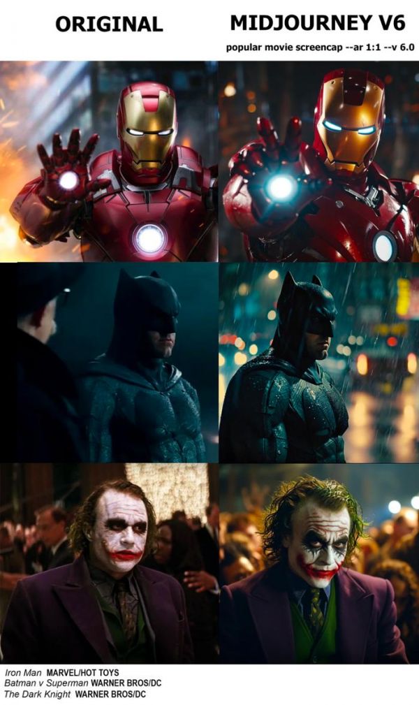 在前文的示例图中,我们会直接提及特定影片(例如《复仇者联盟:无限战争》),这表明 Midjourney 是在完全知情的前提下输出了这些受版权保护的结果。于是新的问题来了:如果用户没有故意这样提示,那么是否同样构成侵权。