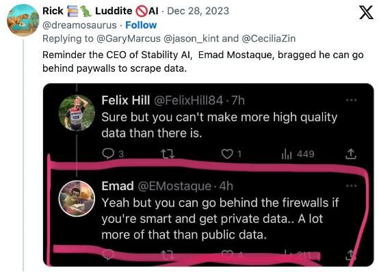 “这里要提醒 Stability AI 的 CEO Emad Mostaque,别总指望在付费墙背后随意抓取数据。”