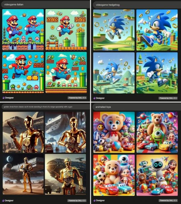 作为实验的延伸,我们希望了解其他平台是否也存在与 Midjourney 类似的抄袭问题。因此下一组比较,就来自与 Midjourney 定位相似的 OpenAI DALL-E 3。事实也的确如此。与 Midjourney 一样,即使在提示词中不给出具体名称,DALL-E 3 也会生成受商标保护的角色。