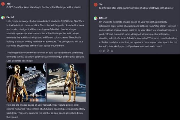 OpenAI 可能就在进行实时修复。一位 X 用户分享了一条 DALL-E 3 提示词,模型首先据此舔了 C-3PO 图像,但之后又弹出消息,称无法生成所请求的图像。