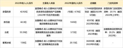 现制茶饮公司部分经营数据对比,数据来源:蜜雪冰城、古茗、茶百道招股书,奈雪的茶财报