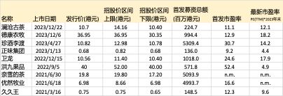 港股一级市场更是遇冷,2023年IPO上市数量、募资总额分别为68只、462.9亿港元,较去年同期(75只、996.2亿港元)分别变动-9.6%、-53.5%,IPO数量和集资额均创十年来新低。据市场机构德勤统计,港交所2023年全球IPO集资额排名降至第6(2022年排名:第4)。分行业看,2023年有关食品、饮料与烟草类别的新股,如澜沧古茶、珍酒李渡、正味集团等多以贴近招股价区间下限定价。